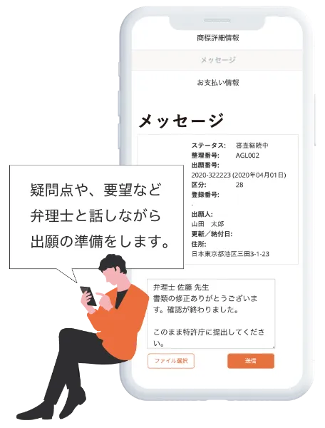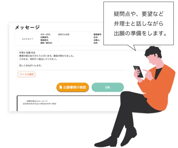 お申込みから特許庁への出願に向けて、Cotobox提携の弁理士とメッセージ機能でやり取りします。このやりとりで、出願書類が整います。